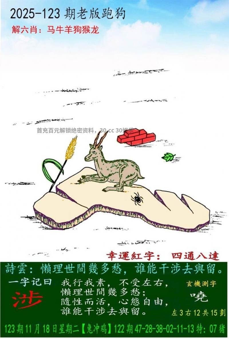 123期港彩创富特码解特开(羊23) 必中六肖:牛马羊蛇鼠虎 必中三肖:牛马羊 必中12码:05.17.12.24.11.23.01.13.06.18.04.16 大小中特:小数 |